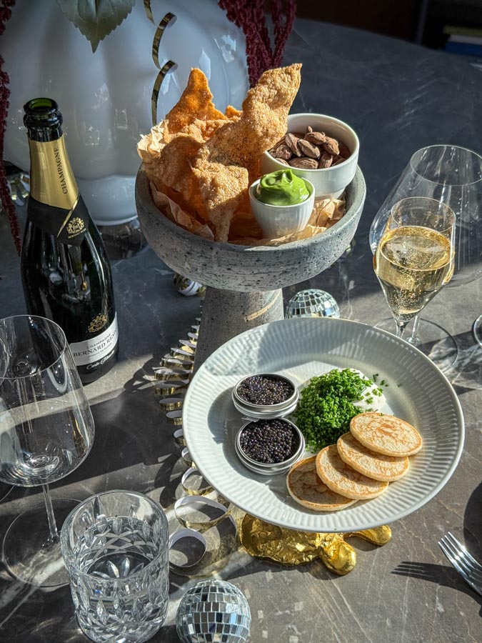 Snacksene kan I nyde sammen med boblerne til Kongens nytårstale. Læs mere om tilkøbsmulighederne til året nytårsmenu længere oppe på siden.