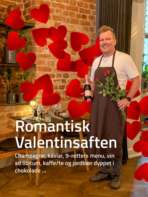 Lørdag den 14. februar skruer vi ekstra op for den romantiske stemning her i restauranten til en helt særlig aften i kærlighedens tegn.