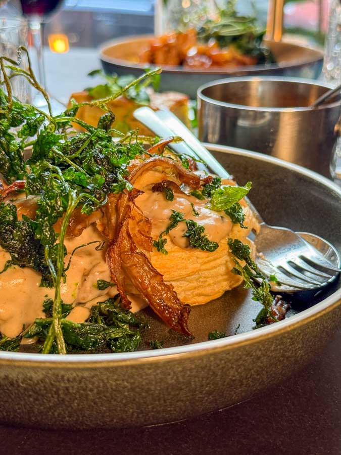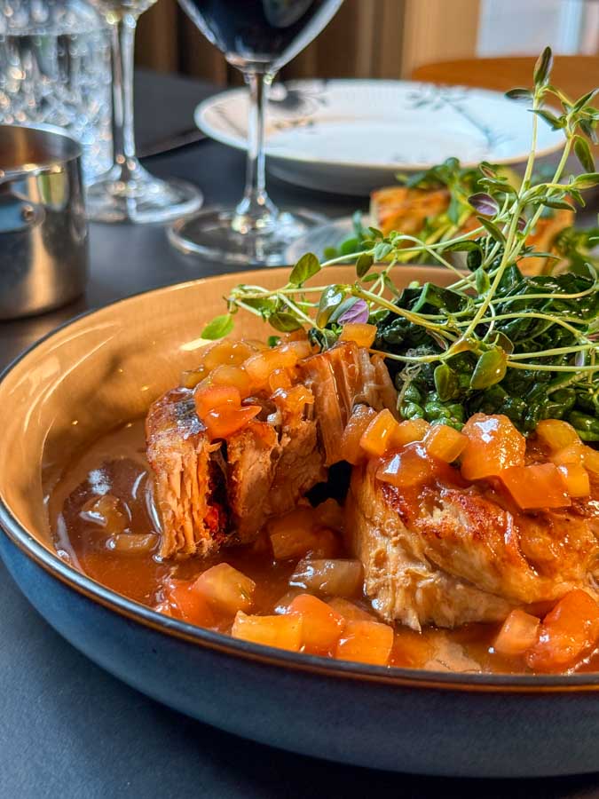 Porchetta med tomat og hvidløg – hertil stegt palmekål, tomatiseret skysauce og pommes Anna