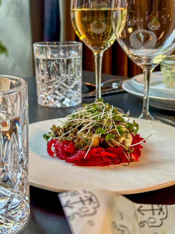 Rødbedetatar med estragonmayo, æbletern og sennepsspirer